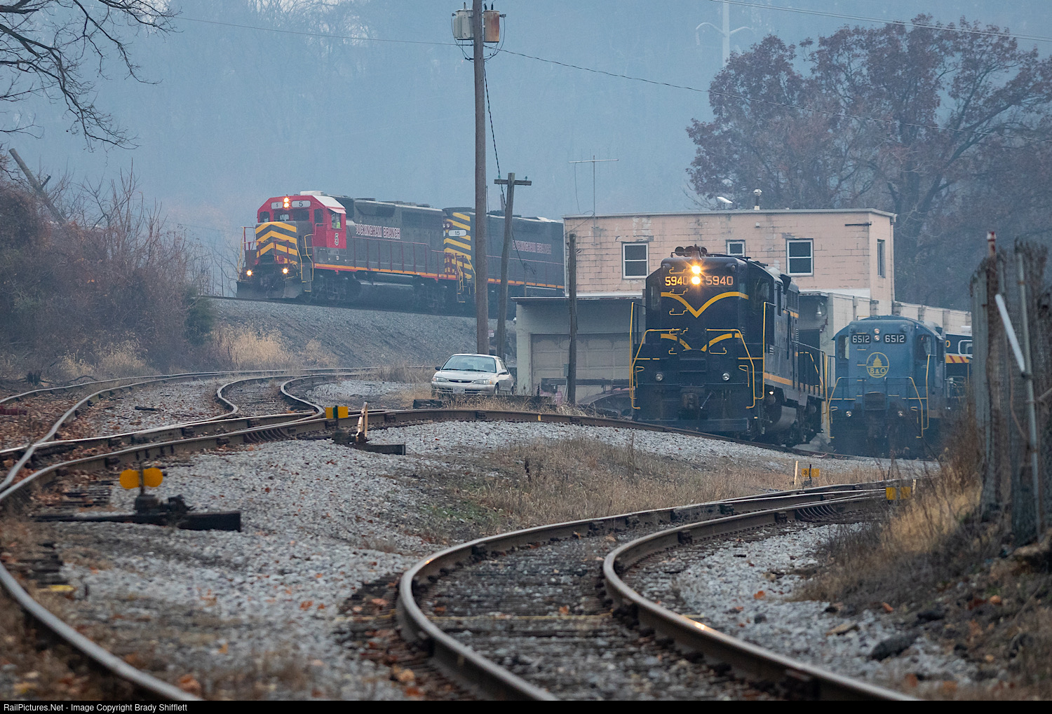 | Buckingham Branch Z631 starts their work for the day as they head east towards cold storage to grab their train for Clifton Forge. Meanwhile, Shenandoah Valley Railroad is seen below starting their day as well. |