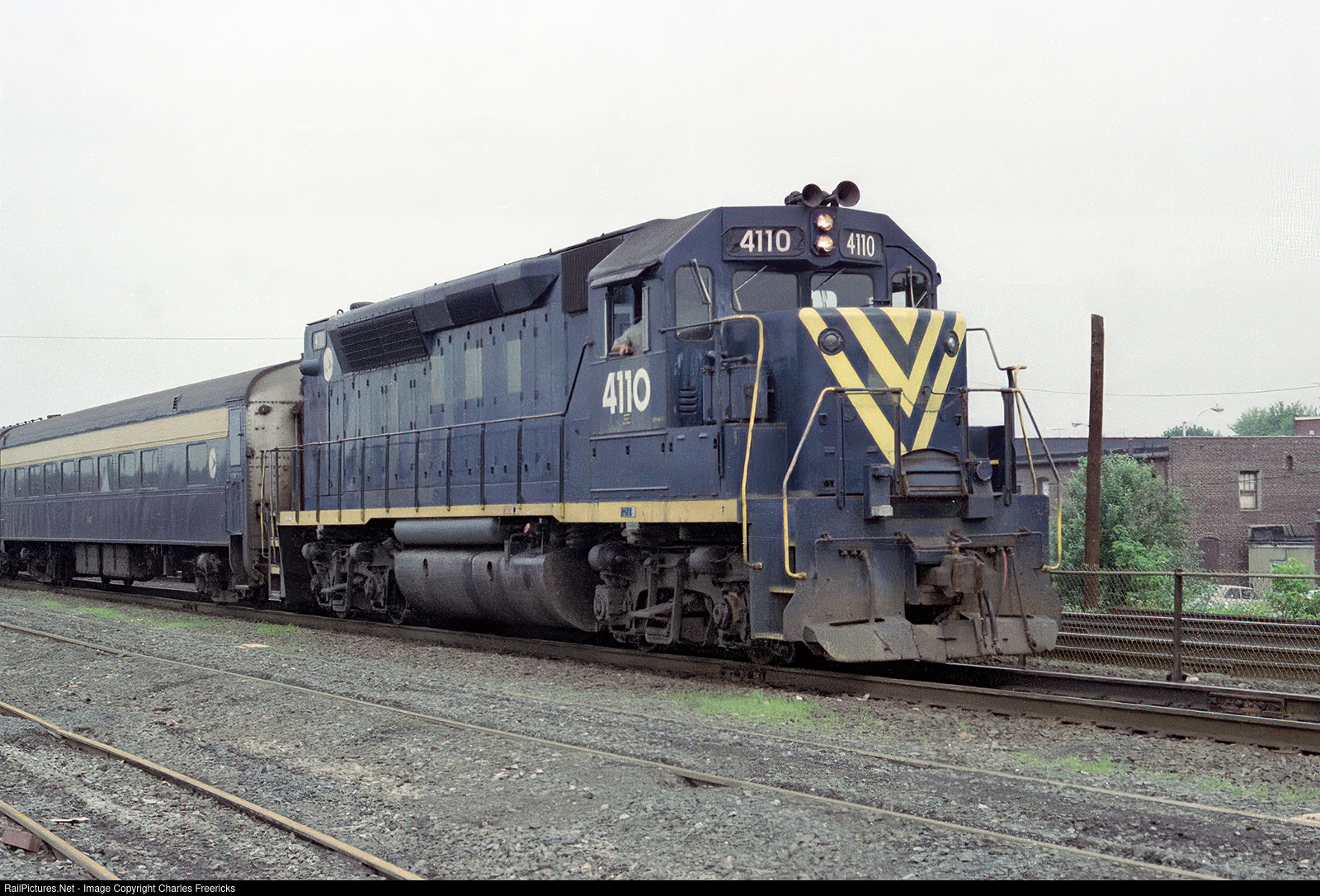 Former CNJ GP40P (Conrail 4110) pulls into Bound Brook with train 5416 to Newark. The GP40P is actually the property of the NJDOT, as it the coach behind it, which while still wearing CNJ colors, is actually a former Missouri Pacific car, built by American Coach & Foundry in 1948.