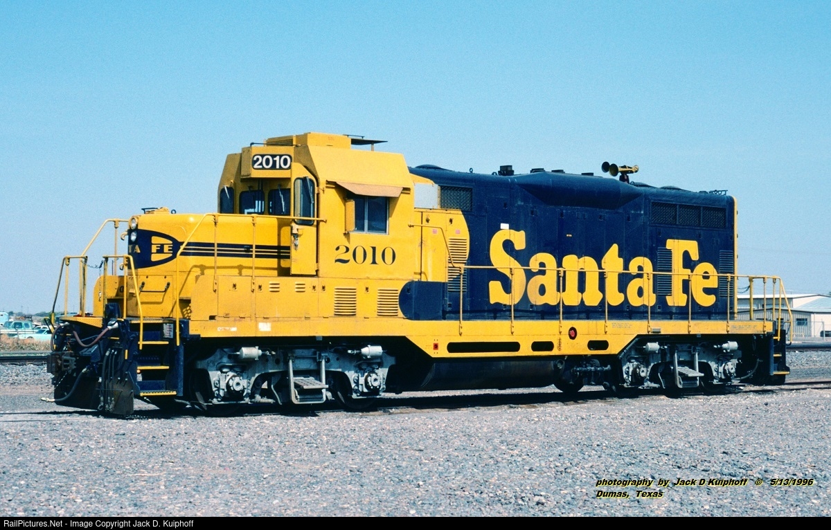 | AT&SF, Santa Fe 2010 GP7u, at Dumas, Texas. May 13, 1996. Jack D Kuiphoff photo © |