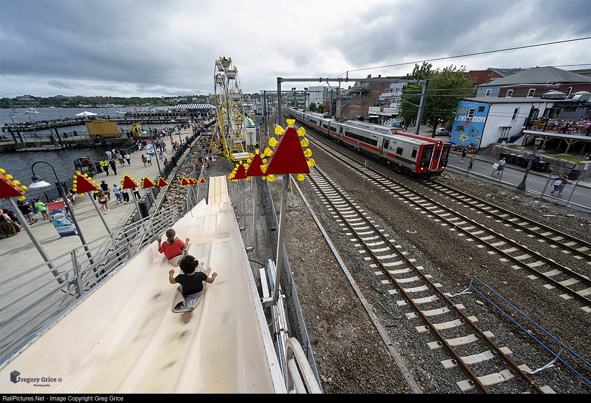 On the cloudy afternoon of July 13, 2024, CTrail Shore Line East train 3034 approaches New London, Connecticut, as festivalgoers enjoy the attractions at Sailfest.