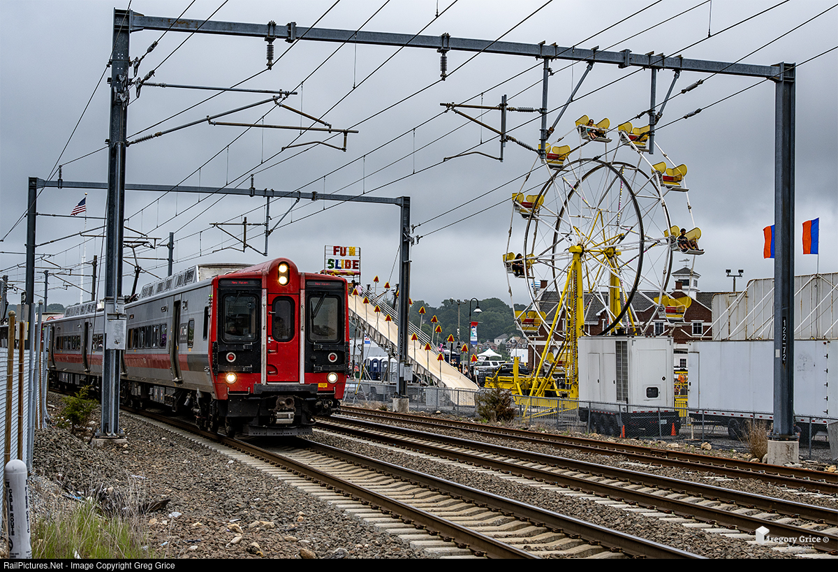 On a cloudy afternoon of July 13, 2024, CTrail Shore Line East train 3645 departs New London, Connecticut, heading towards New Haven along the Shore Line section of Amtrak's Northeast Corridor. In the background, a couple of the attractions at Sailfest add a festive touch to the scene.