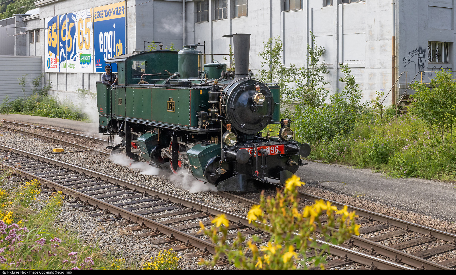 On the day exactly 125 years after the inauguration of the Oensingen-Balsthal Railway (OeBB), both the scheduled freight train and an additional extra freight train were run with steam on this day. SBB Historic's “Mallet” Ed 2x2/2 # 196, built in 1893 by Maffei in Munich for the Swiss Central Railway (SCB) and now stationed in Balsthal, was used. Here, the 0-4-4-0 "Mallet" steam locomotive of 1893 leaves the siding of the loading station near Klus station. The track branches off onto open track and the maneuver has attracted various railroad photographers.