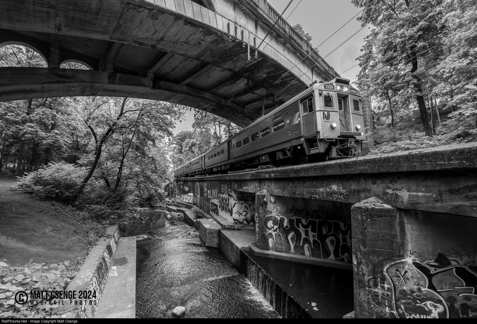 NJ Transit Arrow III no. 1329 is the lead unit on Montclair-Boonton Line train 267, seen crossing the Second River en-route to Montclair State University. |