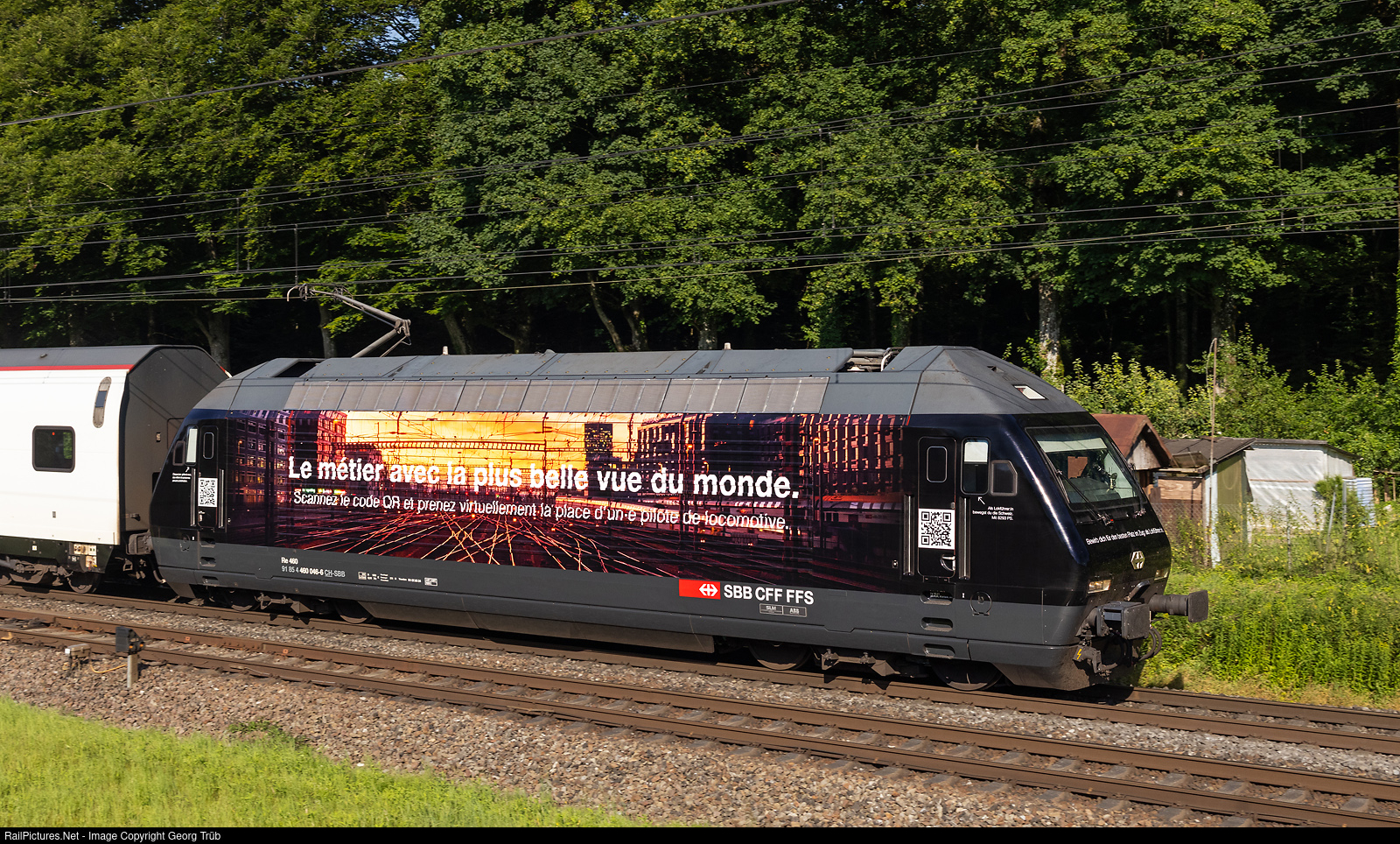 SBB's Re 460 # 046 was given special advertising lettering (foils) to attract new train drivers. It says on the front: Bewirb dich für den besten Platz im Zug als Lokführer:in (Apply for the best seat on the train: as an engine driver). On the side is the address in french: Le métier avec la plus belle vue du monde. Scannez le code QR et prenez virtuellement la place d' un-e pilote de locomotive. (The best job prospects in the world. Scan the QR code now and take a virtual test seat as an engine driver). On the other side of the locomotive, the words are in german. The locomotive pulls the IR 2130 of the IR75 line from Constance via Weinfelden-Winterthur to Zurich, between Winterthur and Kemptthal.