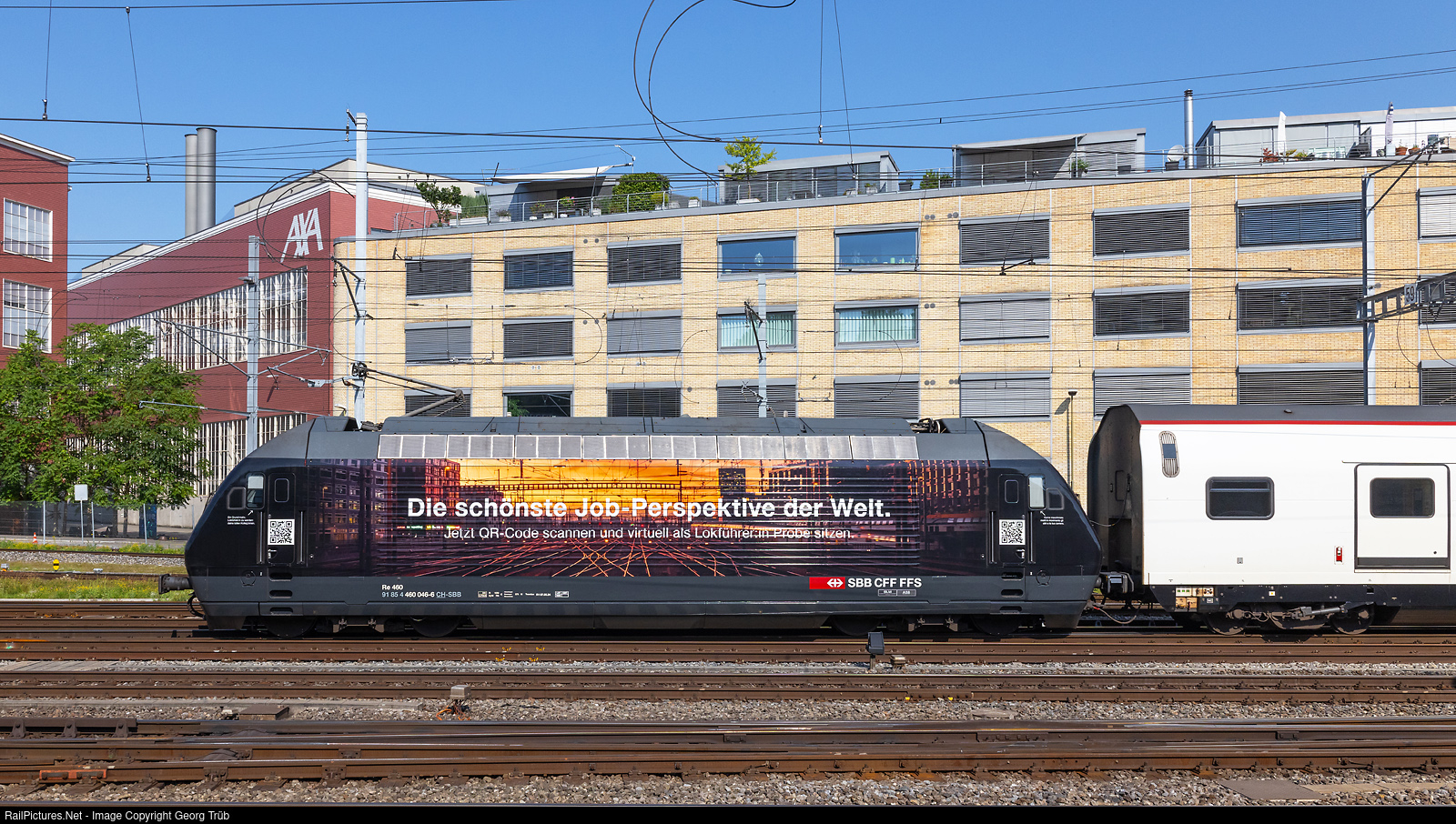 SBB's Re 460 # 046 was given special advertising lettering (foils) to attract new train drivers. It says on the front: Bewirb dich für den besten Platz im Zug als Lokführer:in (Apply for the best seat on the train: as an engine driver). On the side is the address: Die schönste Job-Perspektive der Welt. Jetzt QR-Code scannen und virtuell Probe sitzen als Lokführer:in (The best job prospects in the world. Scan the QR code now and take a virtual test seat as an engine driver). On the other side of the locomotive, the words are in french. The locomotive pulls the IR 2113 of the IR75 line from Zürich via Winterthur-Weinfelden to Constance, entering Winterthur in the rear of the IC2000 push-pull train.