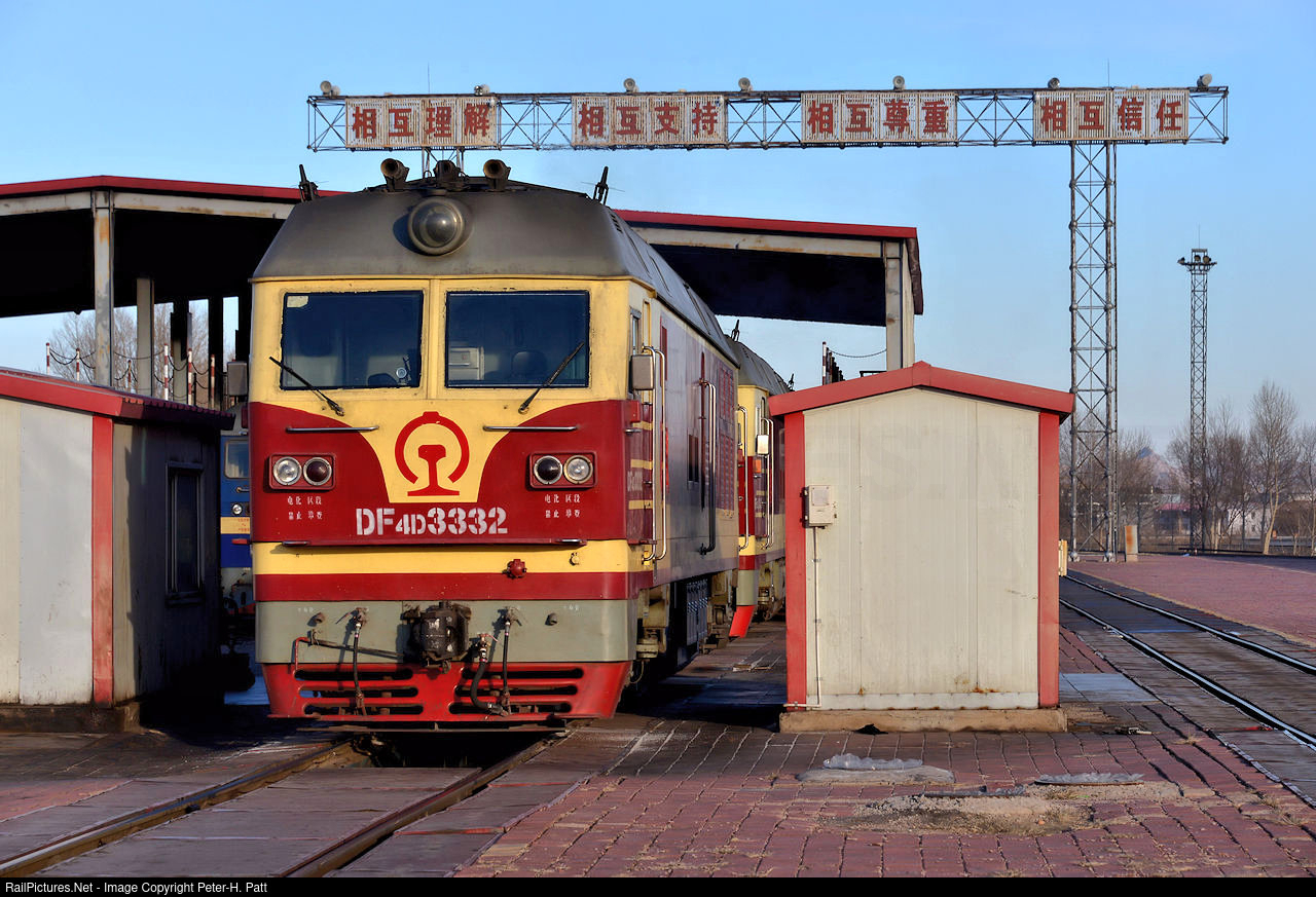 On this photo, DF4D class diesel locomotive 3332 rests at the Daban depot. The locomotive sports the typical passenger train livery of the JiTong railway.