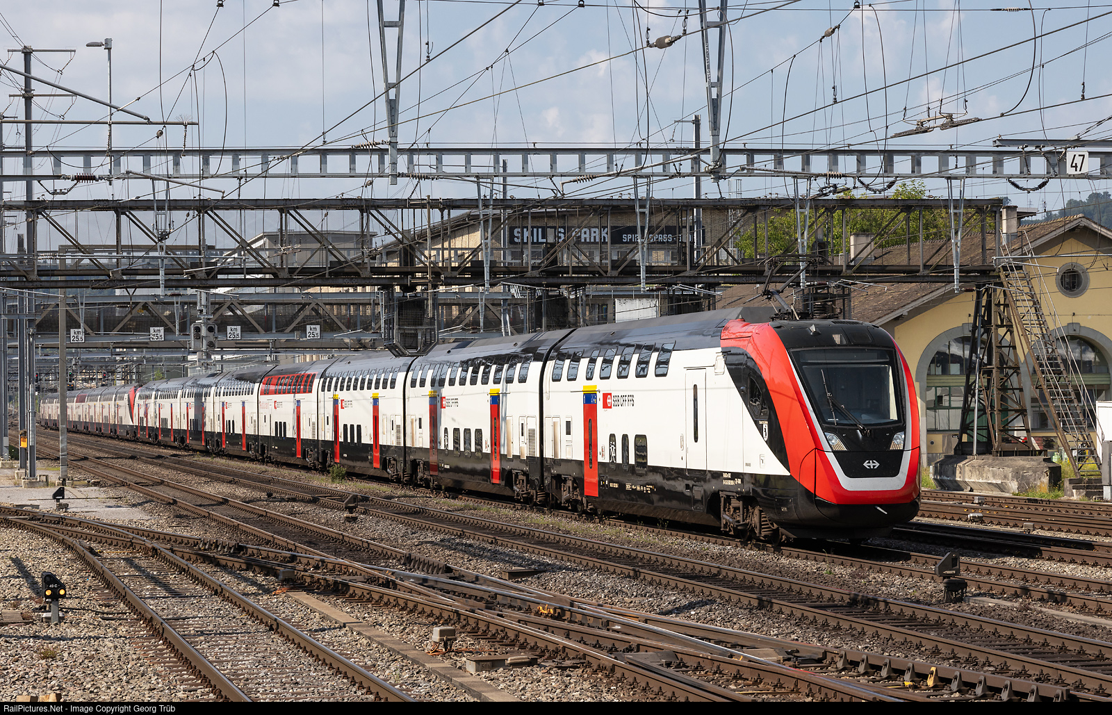 | SBB doubledeck trains for long distances "FVD" RABDe 502 # 009 "St.Gallen" and # 013 in multiple control are entering Winterthur, running as IC 709 of the line IC1 from Geneva Airport via Lausanne-Fribourg-Bern-Zürich to St.Gallen. Both are of type "IC200" with a dining car, small baggage compartment and family area. |