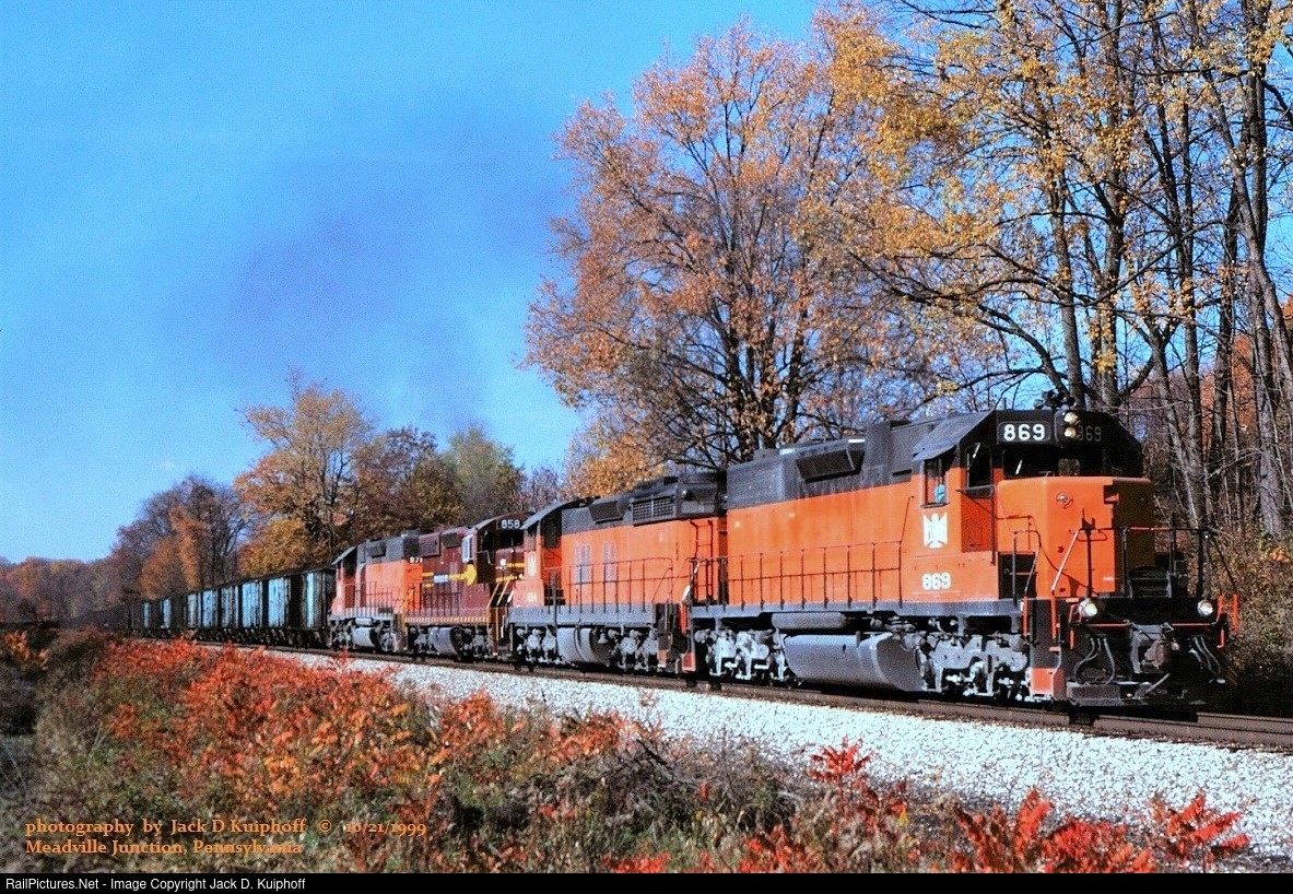 | B&LE, Bessemer and Lake Erie SD38AC 869- SD18 854- SD-M 858 ex-DM&IR 191>319- SD38-2 878, is northbound with a loaded coal train at Meadville, JCT. Pennsylvania. October 21, 1999. Jack D Kuiphoff photo © |
