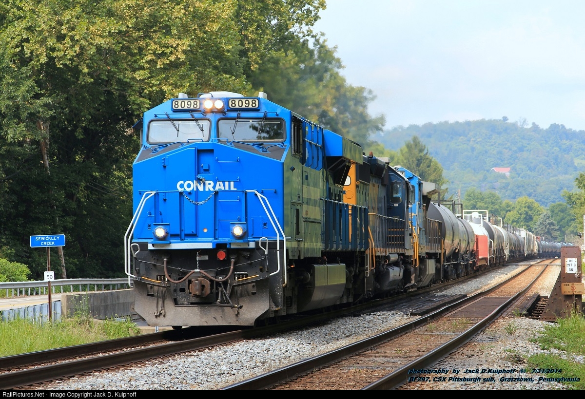 Norfolk Southern, Conrail Heritage unit 8098, leads CSX Q368 east bound across Sewickley Creek at mp BF-297, Gratztown, Pennsylvania. July 31, 2014. Jack D Kuiphoff © photo