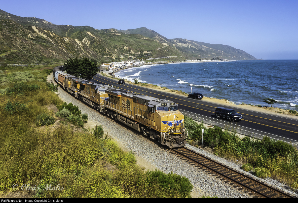 | Northbound Guadalupe local with ES44AC N0. 8218 leading, rolls along Mondos Beach on the Santa Barbara Subdivision in Ventura