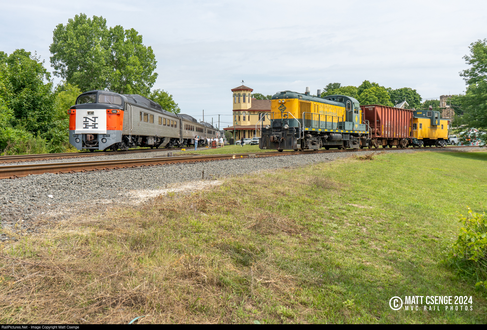 On Saturday, July 20, 2024, the Canaan Railroad Days event in North Canaan, CT featured static displays of railroad equipment at the Canaan Union Depot. At left is the experimental 6-car Roger Williams trainset built by Budd in 1956 for the New Haven Railroad, and at left is a short Housatonic Railroad freight consist - the railroad that now owns and operates the line through North Canaan - featuring ALCO RS-3m no. 9935.