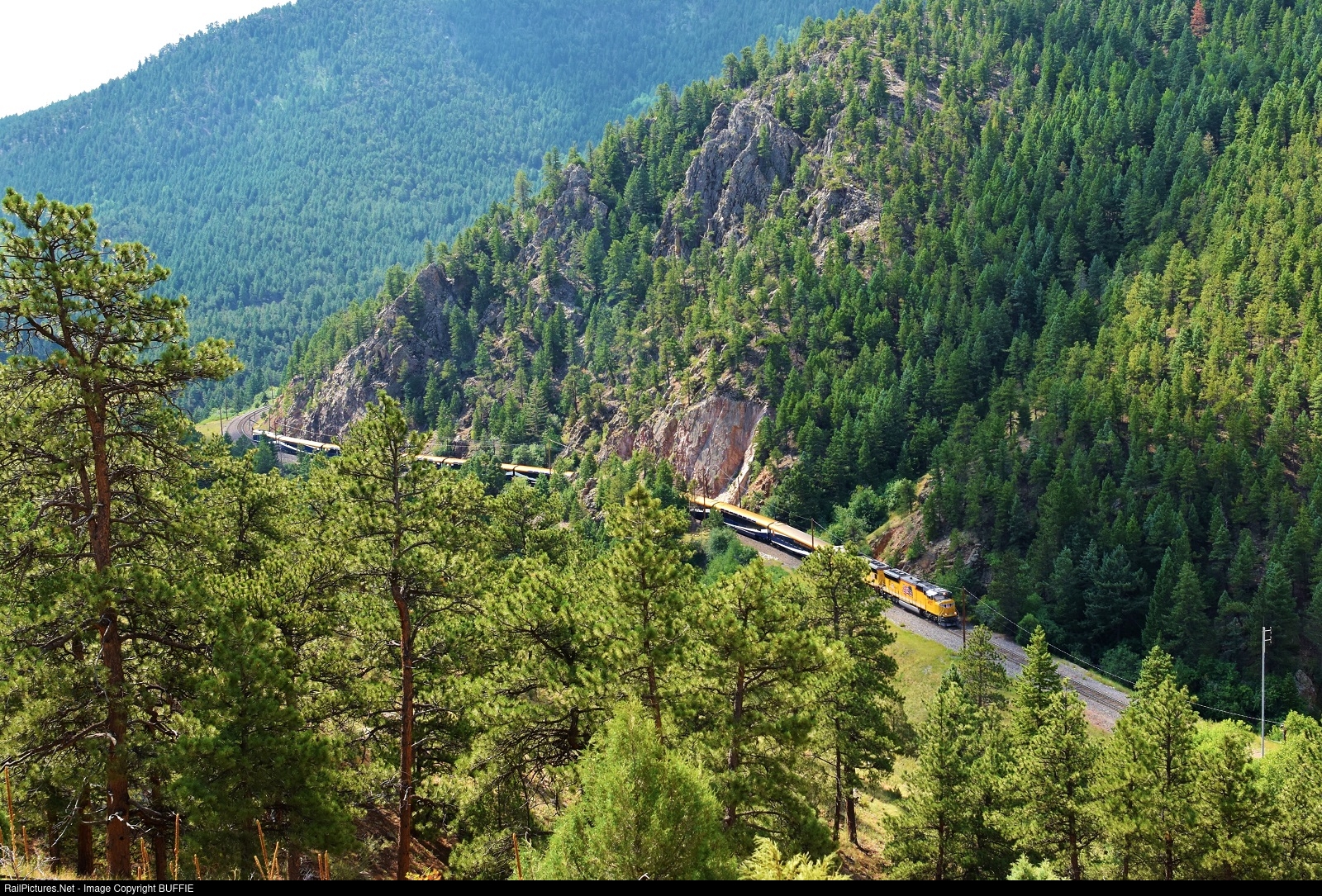 UP 4927 (SD70M) leads the Rocky Mountaineer train through some of the prettiest scenery in the United States, known as South Draw, located between Crescent and Plainview, Colorado.