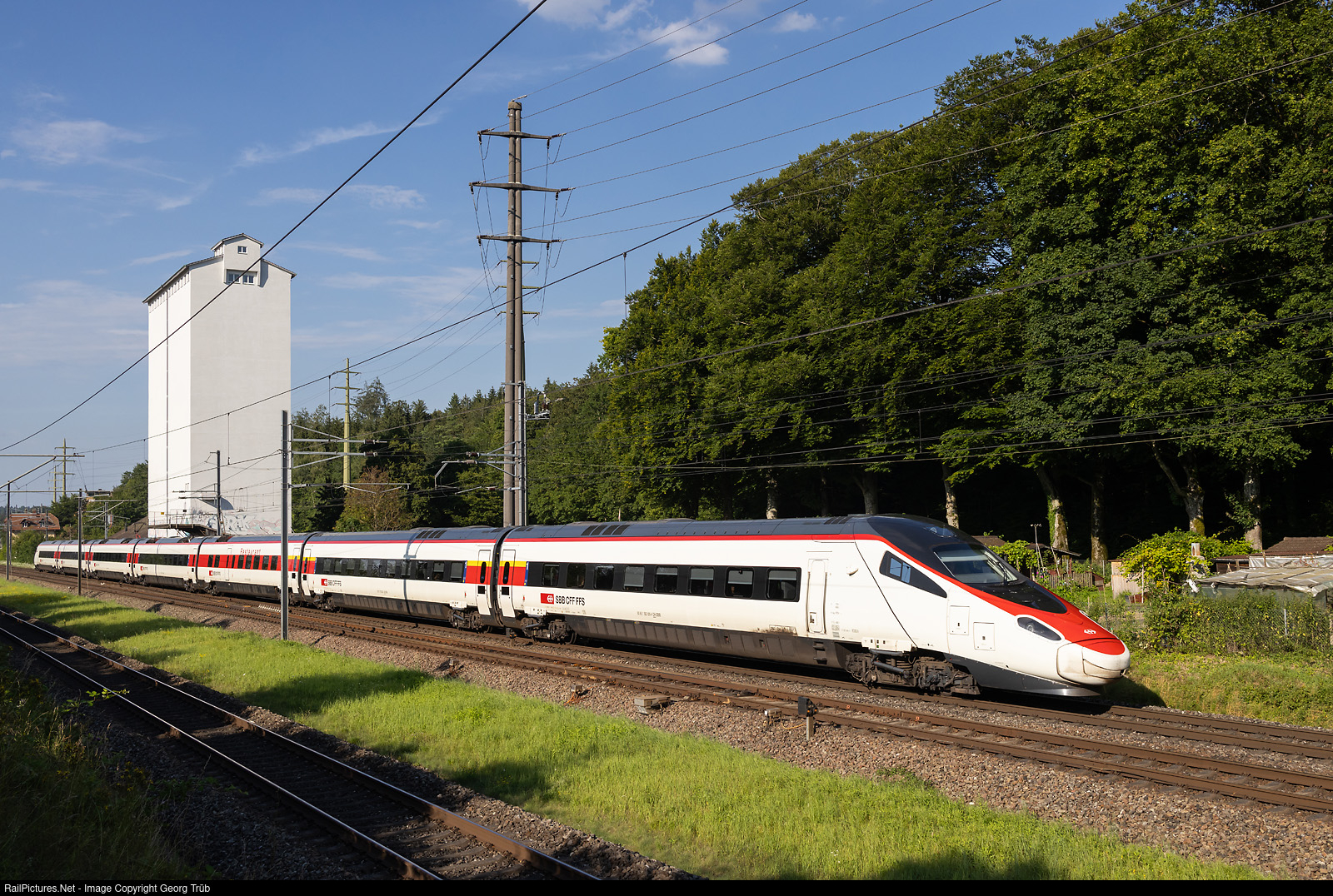 | "Astoro" highspeed tilting train RABe 503 # 020 of the SBB is leaving Winterthur towards Kemptthal as Eurocity 190 from Munich via Lindau Reutin-Bregenz to Zürich. The train is actually about 17 minutes late. The train departed fron Munich 8 minutes late and arrived in St.Margrethen border station with the same delay. Due to a restriction between the Horchental lane change near Goldach and St.Gallen St.Fiden with a single-track route over a length of around 8 kilometers caused by a landslide, the train was therefore unable to travel on the scheduled route via St.Gallen. As a result, EC 190 ran from Rorschach via Romanshorn VL (connecting line)-Weinfelden-Frauenfeld to Winterthur, increasing the delay by several minutes.