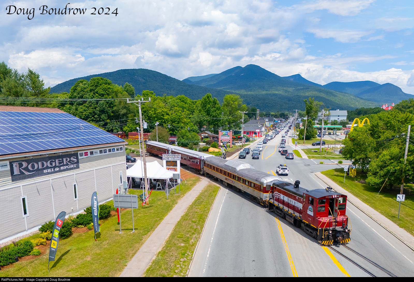 | The 1 pm train of the Granite State Scenic Railway (formerly Hobo Railroad) is seen departing Lincoln across the Kancamagus Highway. Being on vacation in the area, this was an easy few shots to grab despite the less-than-ideal Summer mid-day lighting. The 3,294-foot Big Coolidge Mountain rises above the first coach, with 3.586-foot Whaleback Mountain in the distance above the locomotive. The SW1000 was built in 1970 for Burlington Northern. |