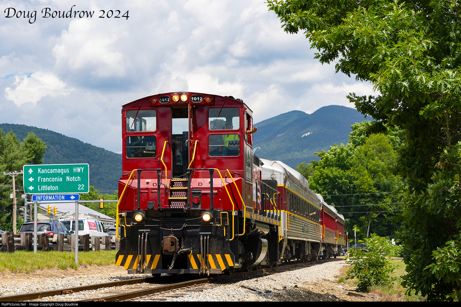 | The 1 pm train of the Granite State Scenic Railway (formerly Hobo Railroad) is seen departing Lincoln along the Kancamagus Highway. Being on vacation in the area, this was an easy few shots to grab despite the less-than-ideal Summer mid-day lighting. The SW1000 was built in 1970 for Burlington Northern. |
