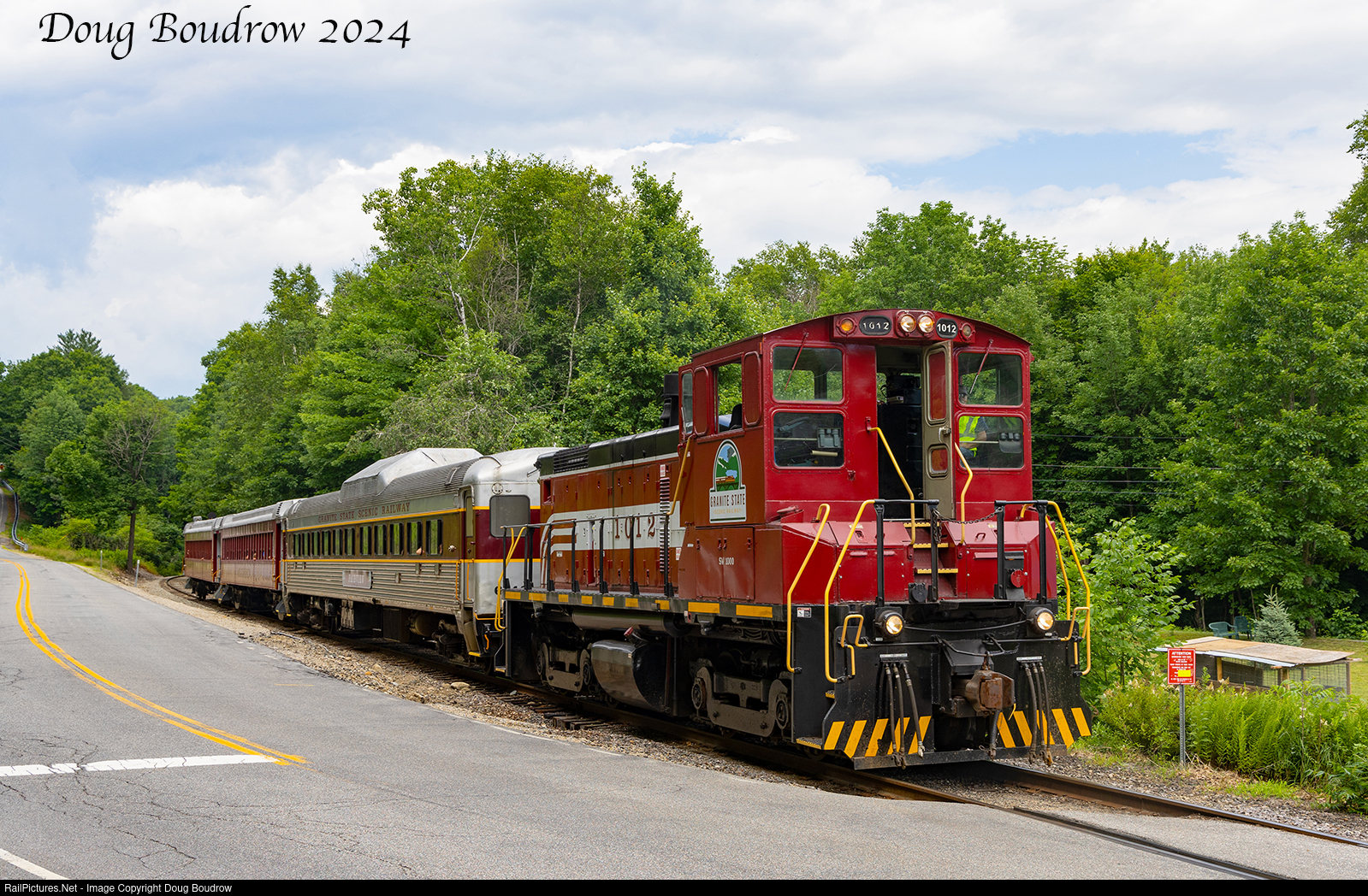| The 1 pm train of the Granite State Scenic Railway (formerly Hobo Railroad) is seen departing Lincoln along the Kancamagus Highway. Being on vacation in the area, this was an easy few shots to grab despite the less-than-ideal Summer mid-day lighting. The SW1000 was built in 1970 for Burlington Northern. |