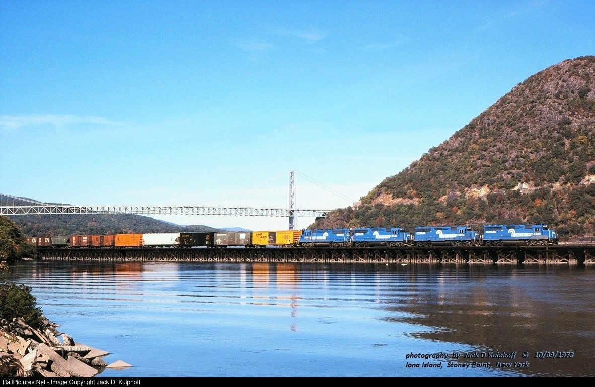 CR, Conrail GP40-2's 3342 -3320 -3341 -3291 with a southbound SECR-9, along the Hudson River on the ex-NYC River Line just below Bear Mountain, at Iona Island, Stoney Point, New York. October 9, 1978. Jack D Kuiphoff