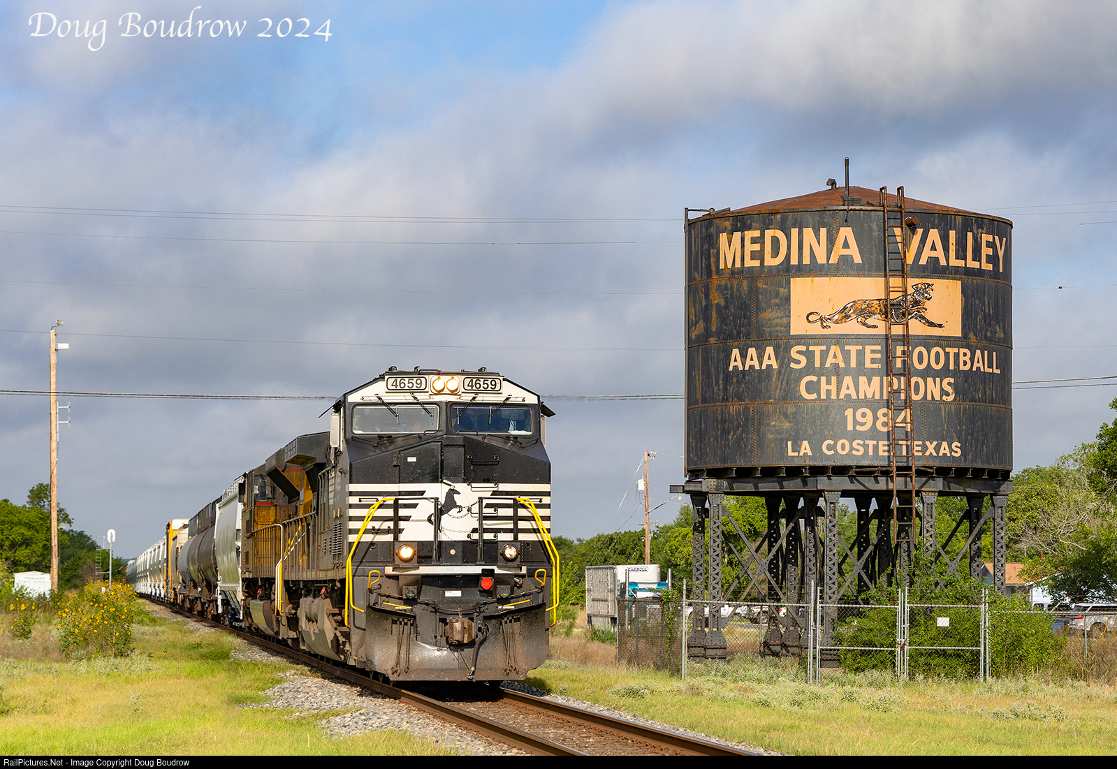 | An Eastbound Union Pacific freight with a foreign leader is seen heading East on the Del Rio Subdivision on a July Morning. The train is passing through the small town of LaCoste and a water tower that serves as a reminder that football is very much a big deal in Texas. |