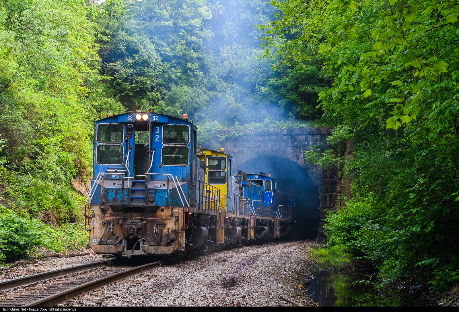 | The sound of four MP15's lugging an empty train out of the tunnel breaks the morning silence in North Bessemer, Pennsylvania as Job 50A departs from the Canadian National interchange with a loaded train of iron ore hoppers bound for the US Steel mill. This section of the railroad was once double tracked with a section of gauntlet track to carry both tracks through the tunnel. |