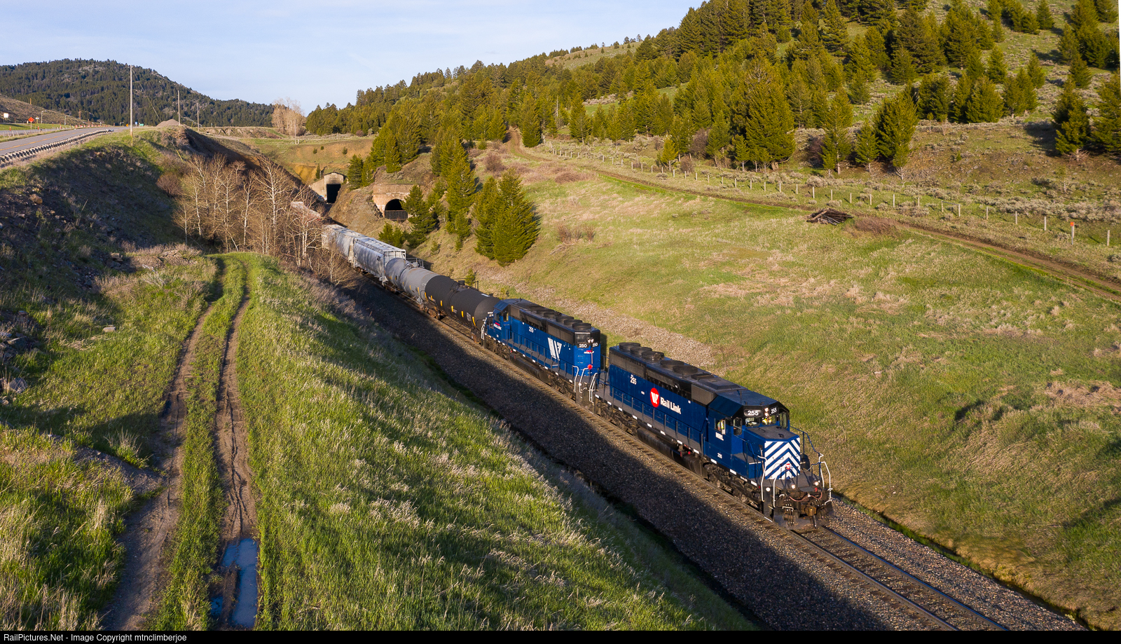 | A pair of Montana Rail Link SD40-2XR's lead a short LAUBOZ freight as they emerge from the tunnel at the summit of Bozeman Pass in West End, Montana and begins its descent towards Bozeman in golden evening light. The older bore that was replaced in 1945 can be seen shuttered to the right of the mainline. |