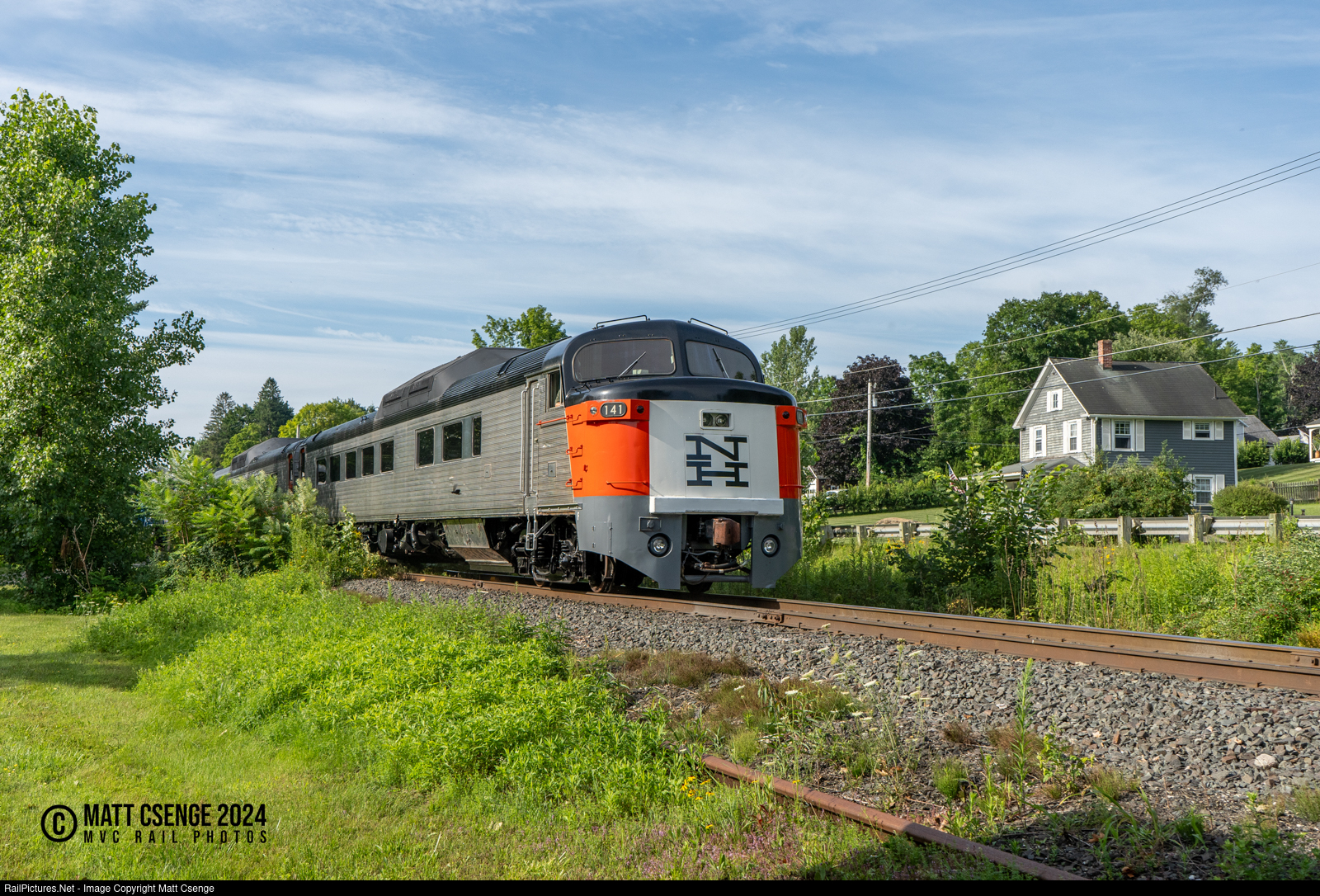 New Haven Railroad (NH) Roger Williams cab car 141 is seen rolling south through the scenic New England landscape of Lenox, MA. The unit, along with siblings 140 and 162 - the only three surviving cars of the experimental 6-car Roger Williams trainset - were on their way from the Berkshire Scenic Railway Museum to the station in North Canaan, CT for display during the Canaan Railroad Days event.