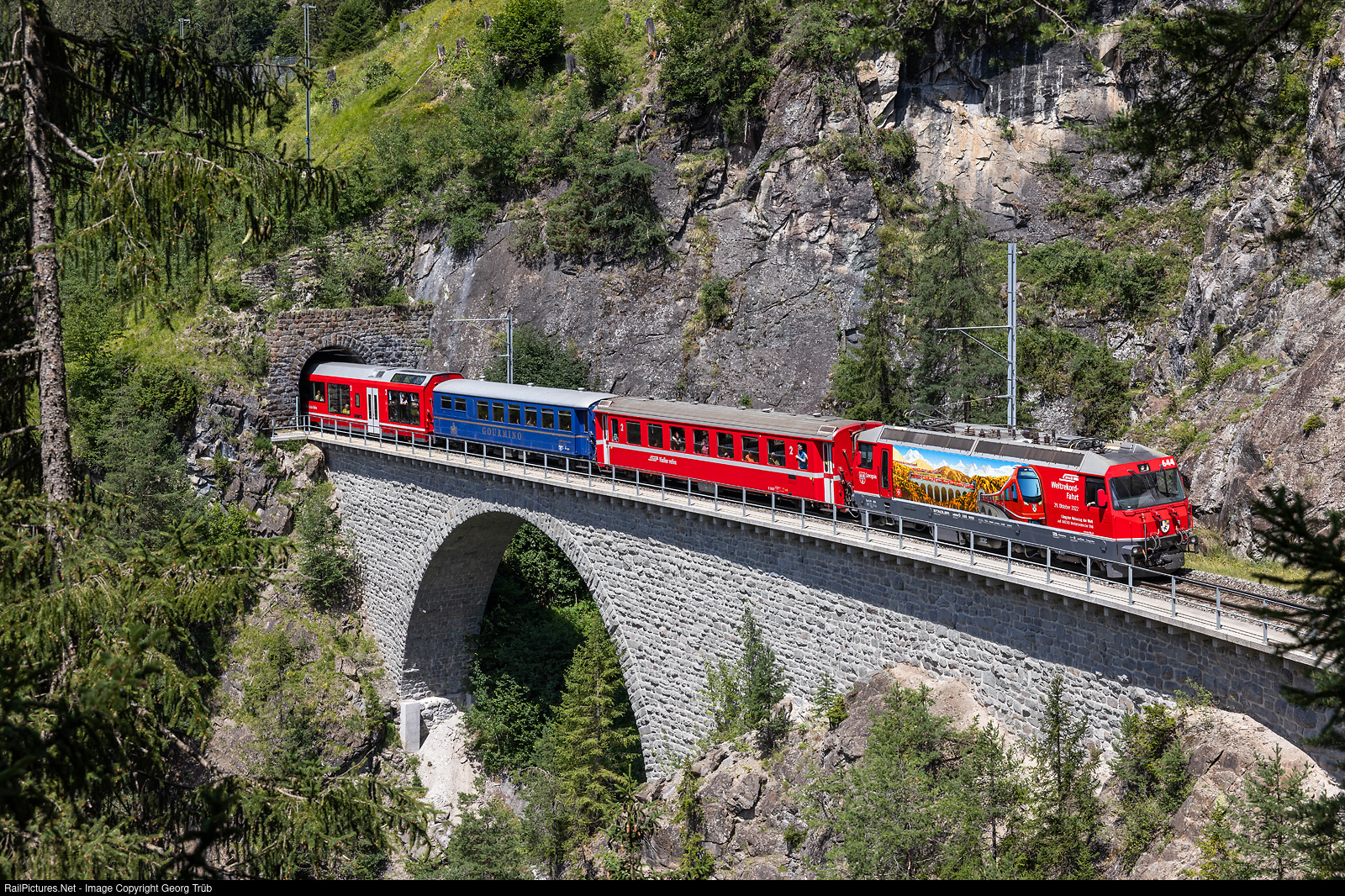 Ge 4/4 III # 644 of the Rhaetian Railway, in the paint scheme for the longest passenger train worldwide, pulls the IR 1137 of the line IR38 from Chur over the Albula line to St.Moritz, crossing the Stulsertobel viaducts. Behind the locomotive a second class standar car type II as reinforcement, then the blue dining car WR # 3810, followed by the ALVRA trainset with photographer area.