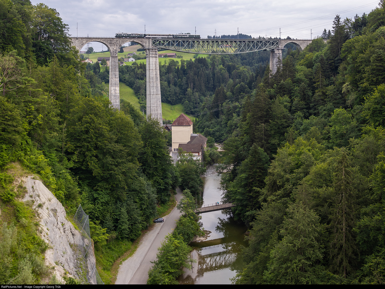 | For a private birthday party, the "Thurgauer Zug" push-pull train of the association Historic Mittel-Thurgau-Bahn (VHMThB) with railcar ABDe 4/4 # 12, former Bodensee-Toggenburg-Bahn "Bodan" parlor car and cab car BDt # 205 ran from Arbon via Romanshorn VL-Weinfelden-Wil SG-St.Gallen-Gübsensee-St.Gallen back to Romanshorn. The train is crossing the highest railway viaduct of Switzerland, the 99 meter high Sitter viaduct of the former Bodensee-Toggenburg-Bahn (BT) between St.Gallen Haggen and Gübsensee. The 365 meter long viaduct with a main span of 120 meter was built between 1908 and 1910 for the Bodensee-Toggenburg-Bahn, and is now owned and operated by the Südostbahn (SOB). |