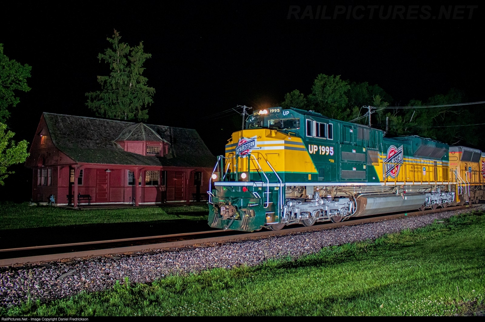 UP 1995, the Chicago & Northwestern heritage unit, leads UP train MBEBE (tonight consisting only of light power) past the historic depot in Wayne, IL. I shot this unit at this same location a couple nights earlier from the other side of the tracks.