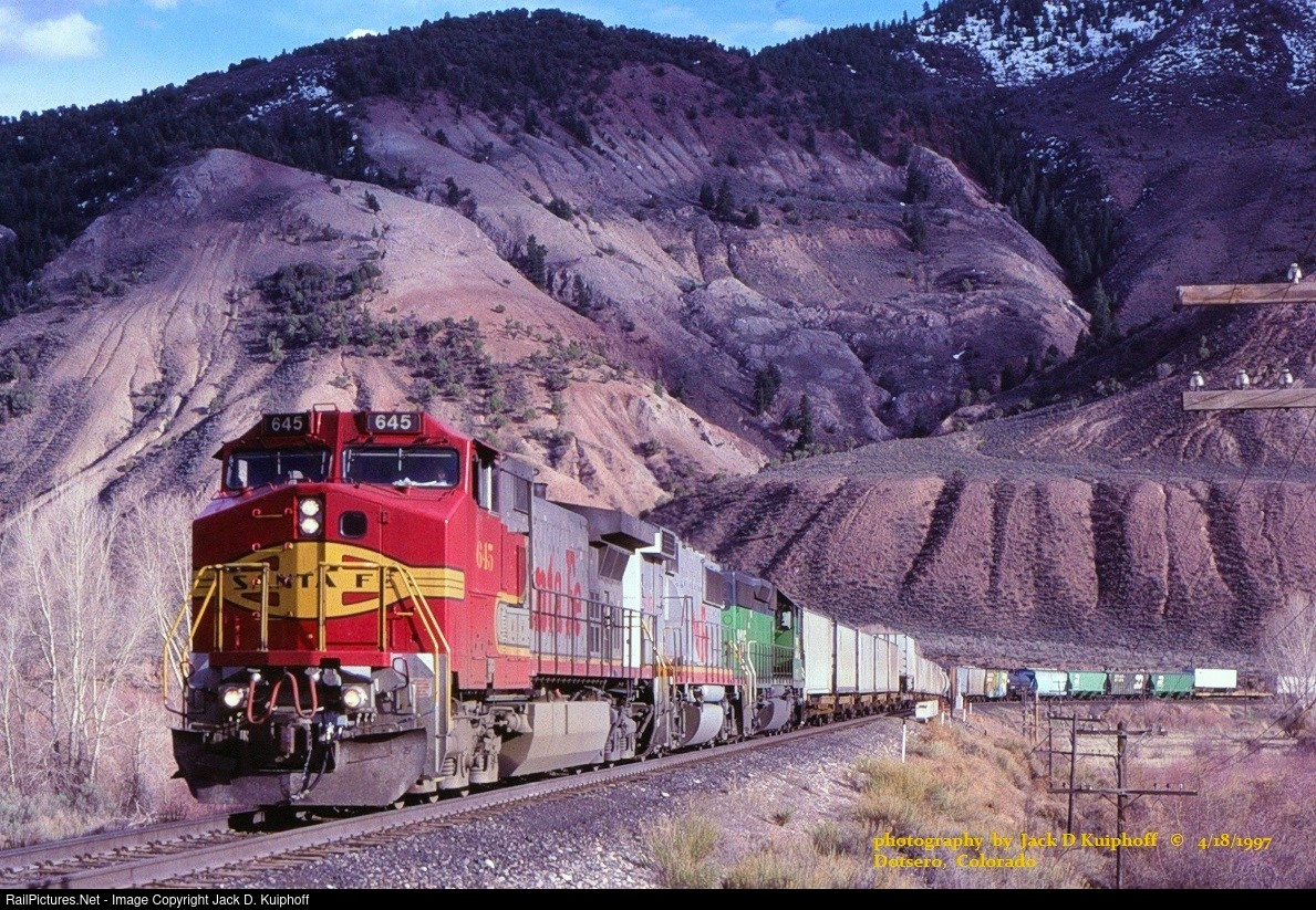 | AT&SF, Santa Fe 645 leads a eastbound on the DRG&W at Dotsero, Colorado. April 18, 1997. Jack D Kuiphoff © photo |