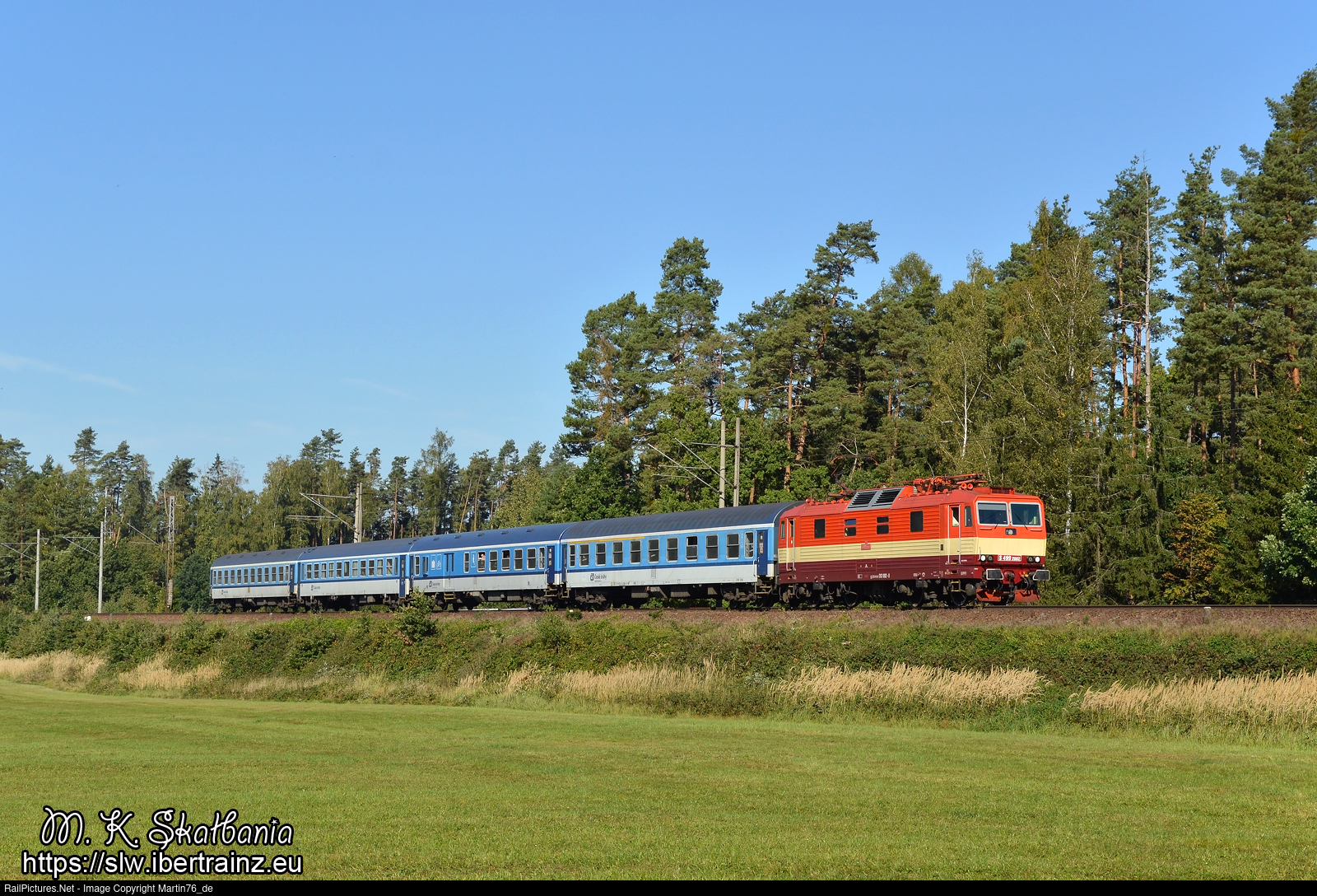 The electric locomotive S499.2002 hauling a passenger train "Rozmberk" from Plzen hl.n. to- Brno hl.n.