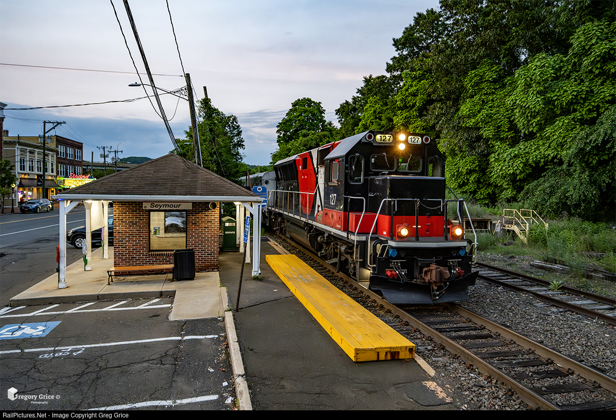 On the late evening of June 4th, 2024, south-facing CTDOT Brookville BL20GHM 127 leading leads Metro-North Railroad train 1995 into the station at Seymour, Connecticut on the Waterbury Branch.