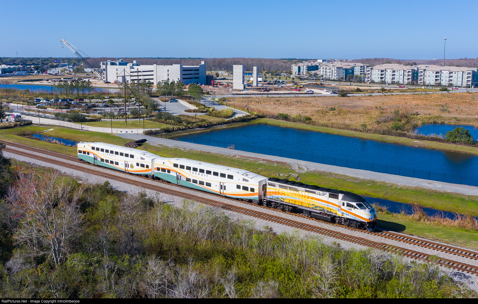 | With one of Sunrail's unique MP38PH-Q locomotives shoving on the rear, mid-morning commuter train P315 slows as it approaches the platforms of the Tupperware Station, located north of Kissimmee, Florida. Sunrail operates commuter services around Orlando on the Central Florida Rail Corridor between Deland and Campbell. |