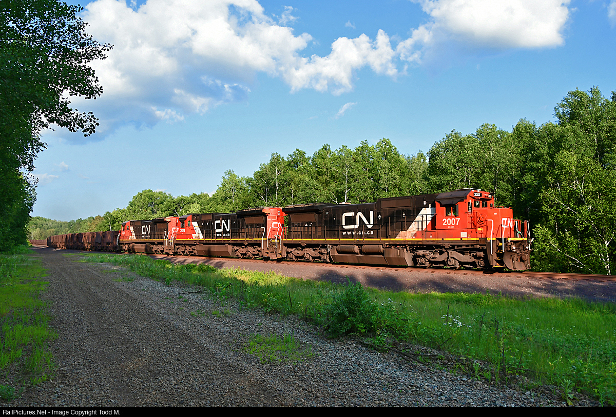 | Navigating the S-curve, CN 2007 north is making the turn on what was the former DM&N, then DM&IR and now the CN Iron Range Sub passing by the grade of the former D&IR which was abandoned in 1972. |