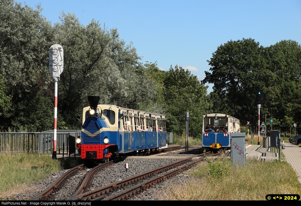 Narrow gauge train from Zwierzyniec to Maltanka is slowly starting from Balbinka Station and in a very this time the train of opposite route also leaving the station after the passing through.