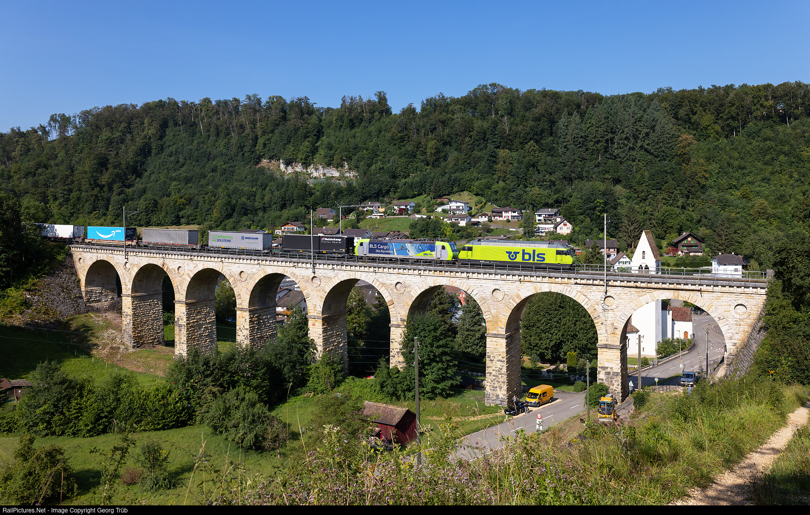 Due to construction work in the Hauenstein Base Tunnel with partial single-track operation for several weeks, various trains are canceled and others are rerouted via the old, single-track Hauenstein line from Olten via Läufelfingen to Sissach. The “Cargo-Beamer” train 43756 from Domodossola via Brig-Lötschberg base tunnel-Thun-Burgdorf-Olten to Basel-Kaldenkirchen/Germany, crosses the 25 meter high Rümlinger viaduct (built 1856 to 1858) between Buckten and Sommerau, pulled by the Re 465 # 012 and the Bombardier TRAXX F140 AC1 Re 485 # 015 from BLS Cargo. The S-Bahn line 9 service between Olten and Sissach will be completely suspended during this time and replaced by a half-hourly bus service.