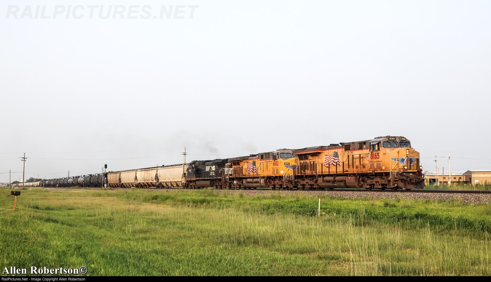 UP 8165, 6882, & NS 9757 westbound with 199 cars.