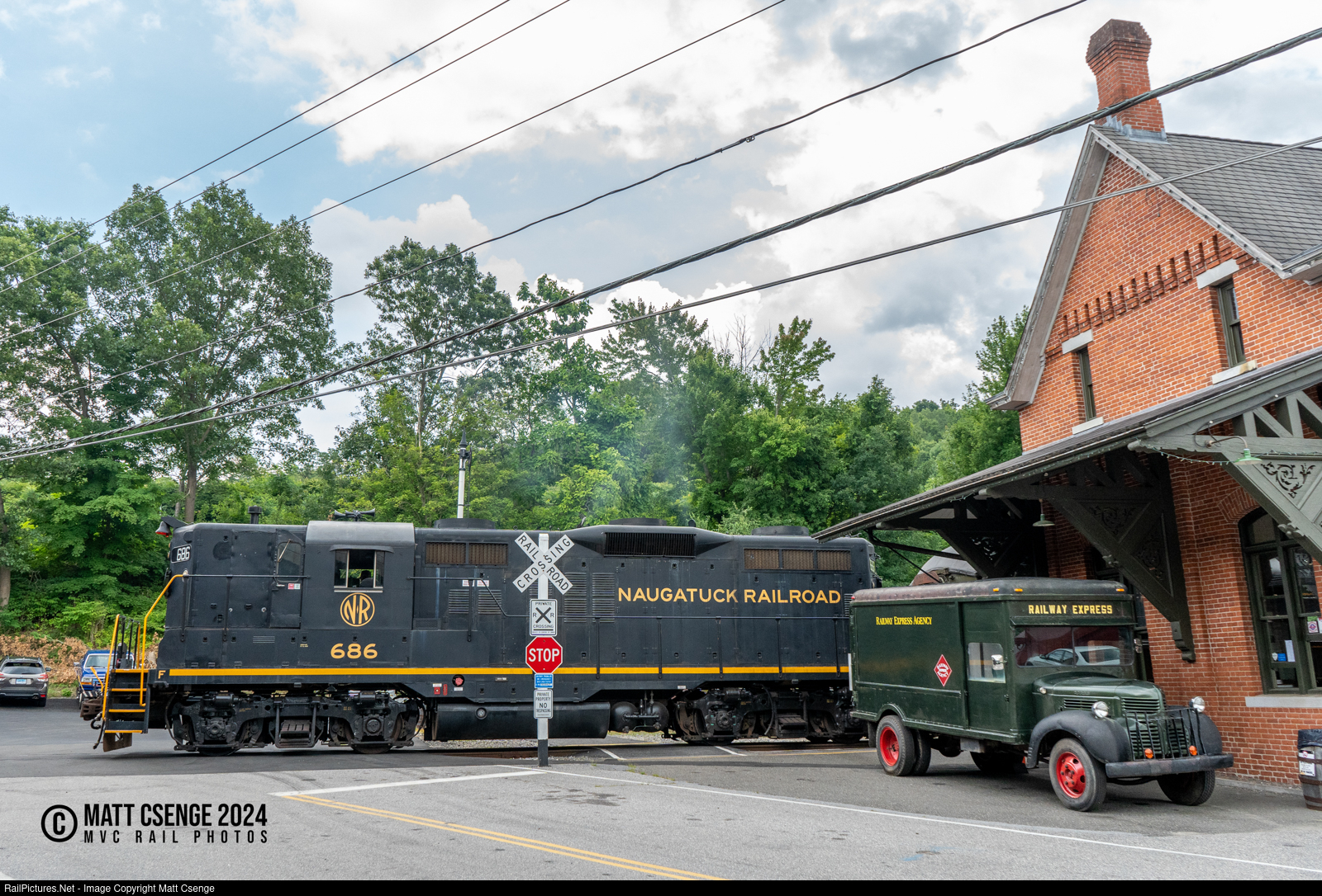 Naugatuck Railroad GP9 no. 686 is seen departing the station at Thomaston with a Railroad Museum of New England excursion. The train is passing one of the museum's newest acquisitions: a 1946 Dodge truck from the Railway Express Agency. |