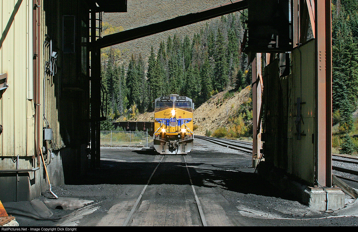 UP 5773 with an empty train, has just arrived at the Skyline flood loader, however the loader operator is nowhere to be found. This location is about 2 or 3 miles south of the village of Scofield, Utah on the Wasatch Plateau, at an elevation of around 8200 feet. The mine proper is up a side canyon a couple of miles to the west. While waiting, I took this shot looking through the loader.