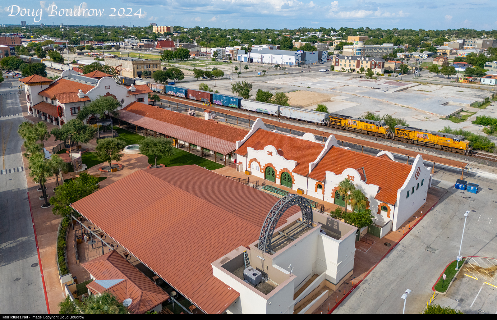 A Westbound Union Pacific freight is seen heading West through downtown San Antonio, Texas passing the 1902-built Southern Pacific Sunset Depot. The depot building is home to the 1902 nightclub and the Espee outdoor concert venue, which can be seen in the photo. Amtrak's Sunset Limited and Texas Eagle both still stop here today utilizing a smaller station next to the original depot.
