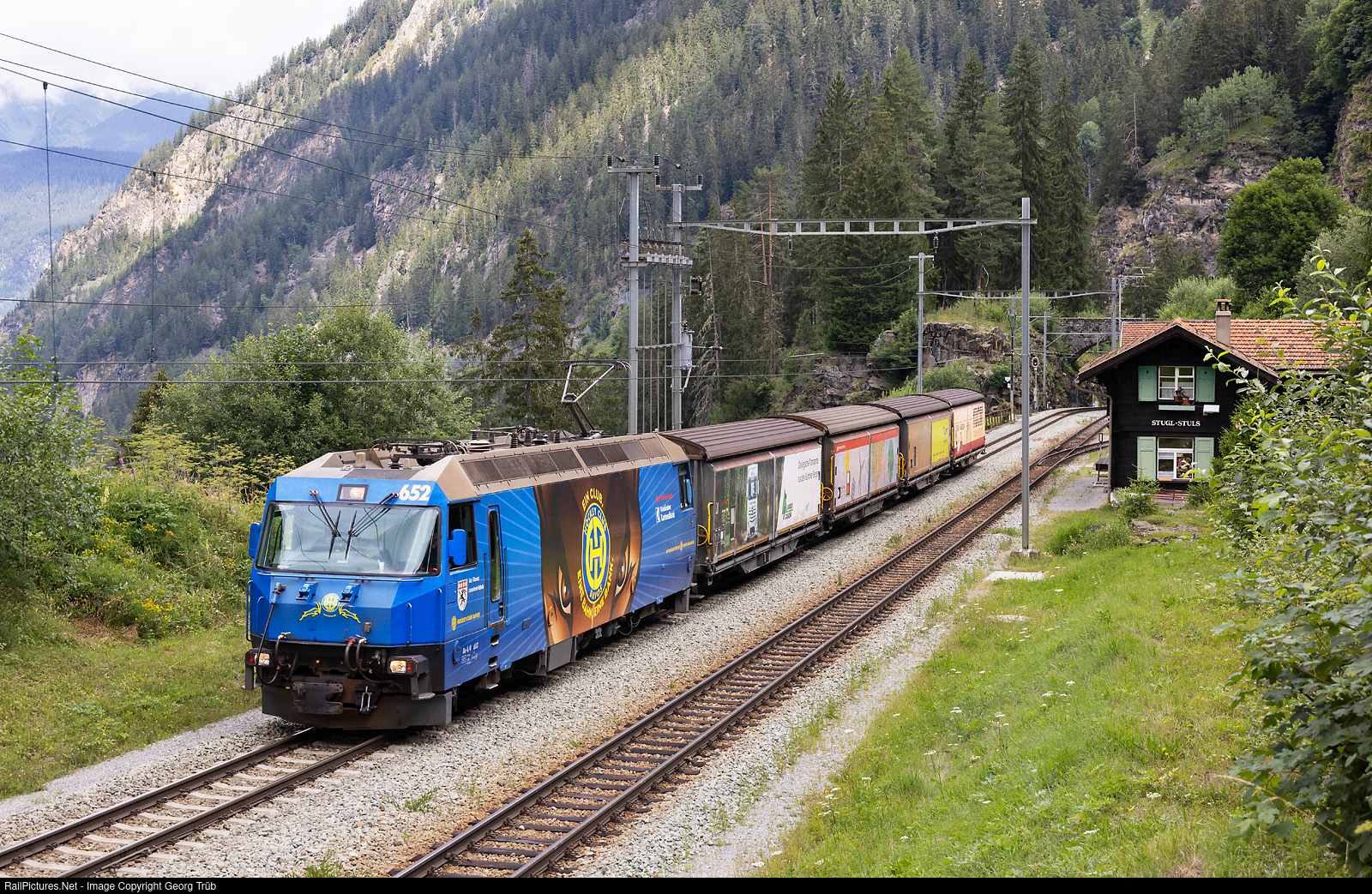 | Ge 4/4 III # 652 "Hockey Club Davos" of the Rhaetian Railway pulls the freight train 5129 from Landquart freight yard over the Albula line to Samedan through the lonely station of Stugl/Stuls, which has no passenger train stops since decades (about 50 years). |