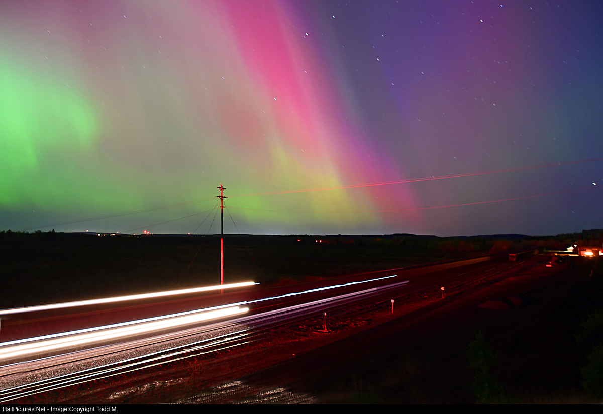 The show must go on as two iron ore trains meet at Biwabik while the aurora borealis light up the night sky.