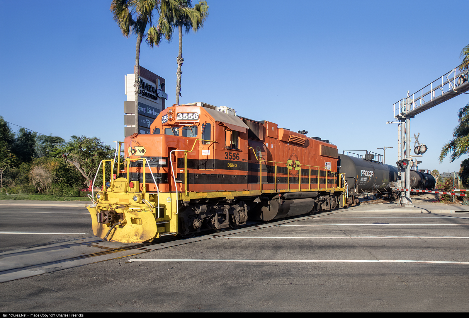 Only place in Southern California you can get a freight train crossing world famous Pacific Coast Highway is right here in El Segundo, CA. Rail Link is Genesee & Wyoming's contract-switching service. They operate the Chevron switching jobs within the Chevron Refinery in El Segudno, as well as out on the UP El Sengundo Industrial Lead (where they are seen here) and the BNSF Harbor Sub (which the train's rear is entering at an unseen switch). Power consists of this GP38-2, an SW1500 and a Genset, but the GP38-2 seems to be the preferred unit.