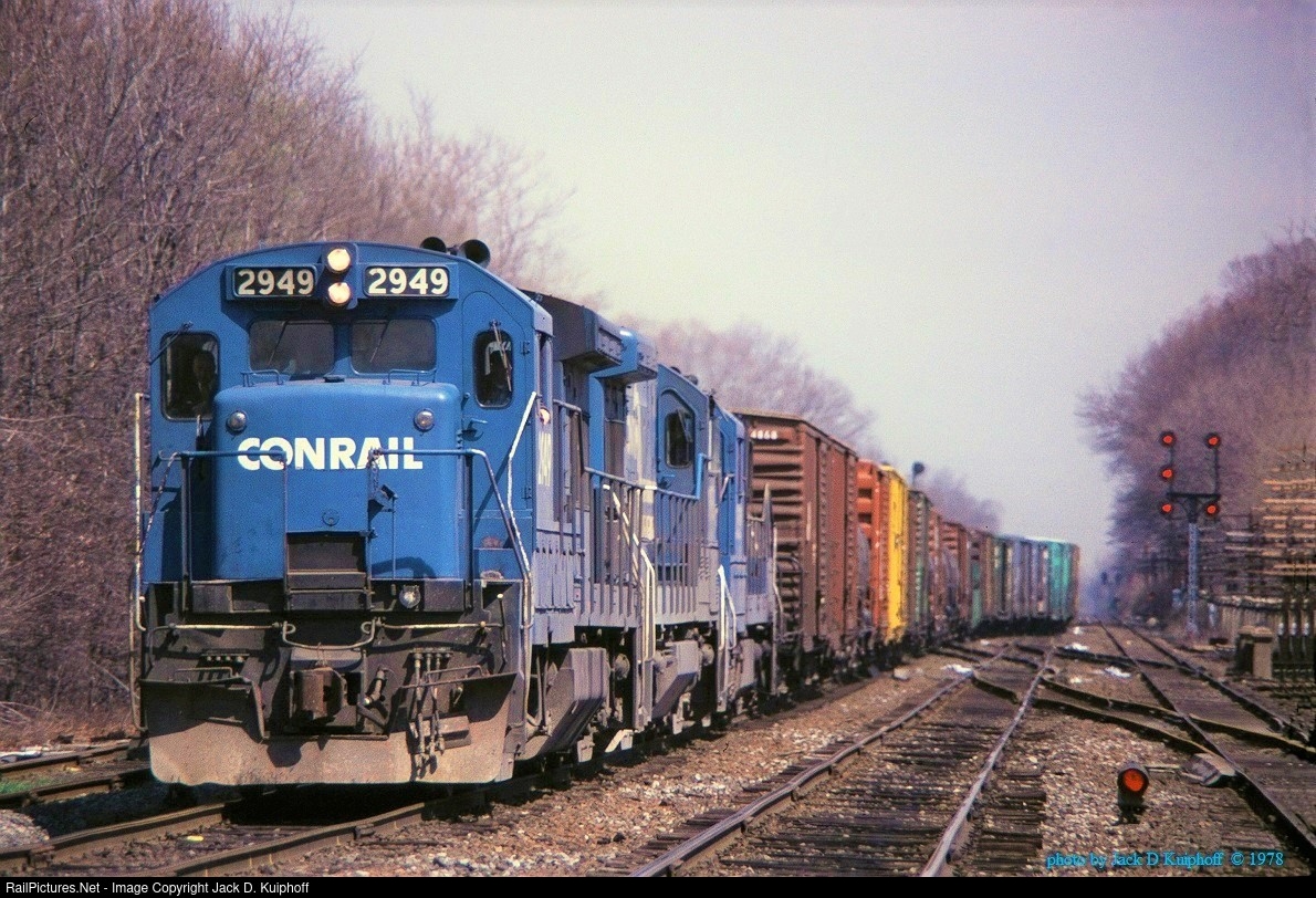 | CR, Conrail U33B 2949 B23-7 1978 GP35 2565 with eastbound IHCR-1, on the ex-Erie at Ridgewood Junction Glen Rock, New Jersey April 12, 1978. Jack D Kuiphoff © photo |