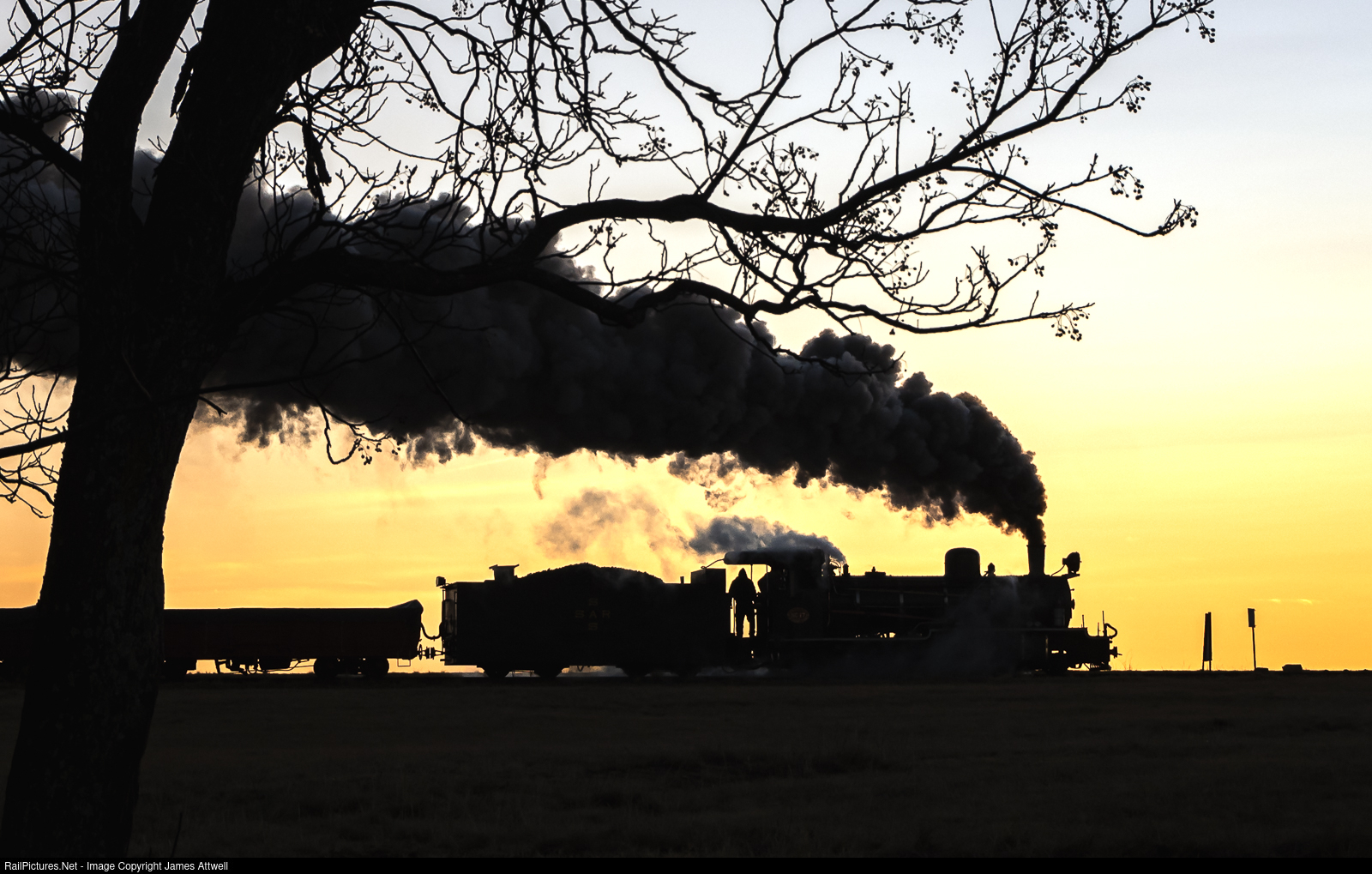 | On a freezing July morning, former South African Railways' Class NG 15 No. 17 steams out of Hoekfontein towards Grootdraai, framed by the backdrop of the rising sun.