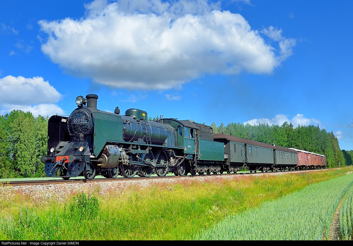 Known as ”Ukko-Pekka”, the Pacific locomotive #1009 of the Hr1 class was the most powerful passenger type of steam engine to be used in Finland. A total of twenty-two were constructed by the Lokomo and Tampella workshops between 1937 and 1957 to meet the demand of heavier and faster expresses that were getting beyond the capacity of the earlier 4-6-0 passenger engines. The two Ukko-Pekka prototypes (#1001 and 1002), ordered by the Finnish State Railways from Lokomo of Tampere, were massive in comparison to older types of engine. Four more (#1000/03/04/05) were added in 1939 and 1940, then a batch of six (#1006-11) in 1948 and 1949, and eight others (#1012-19) in 1955. The final two (#1020-21), built in 1957, were fitted with roller-bearings and represented advanced steam locomotive technology. The twenty-two Pacifics formed the backbone of motive power serving the heavy rail tracks in southern Finland until 1963 when they were gradually replaced by diesels. Two of the Ukko-Pekka Pacifics are presently kept in working condition in Finland, #1021 owned by Finnish State Railways, and the #1009. #1009 is representative of production during shortages in the aftermath of the war, it’s number plates and cab numbers being aluminium instead of brass. In every other way the engine is typical of its class. The engine was restored to working order and passed for mainline running in 1993 when under the ownership of Nigel Sill from London who financed and directed the undertaking. The maiden passenger journey took place on 22 May 1993 – a return working from Pieksämäki to Joensuu. #1009 is presently stabled in Kouvola. Source: Höyryveturimatkat 1009 Oy Internet homepage.
