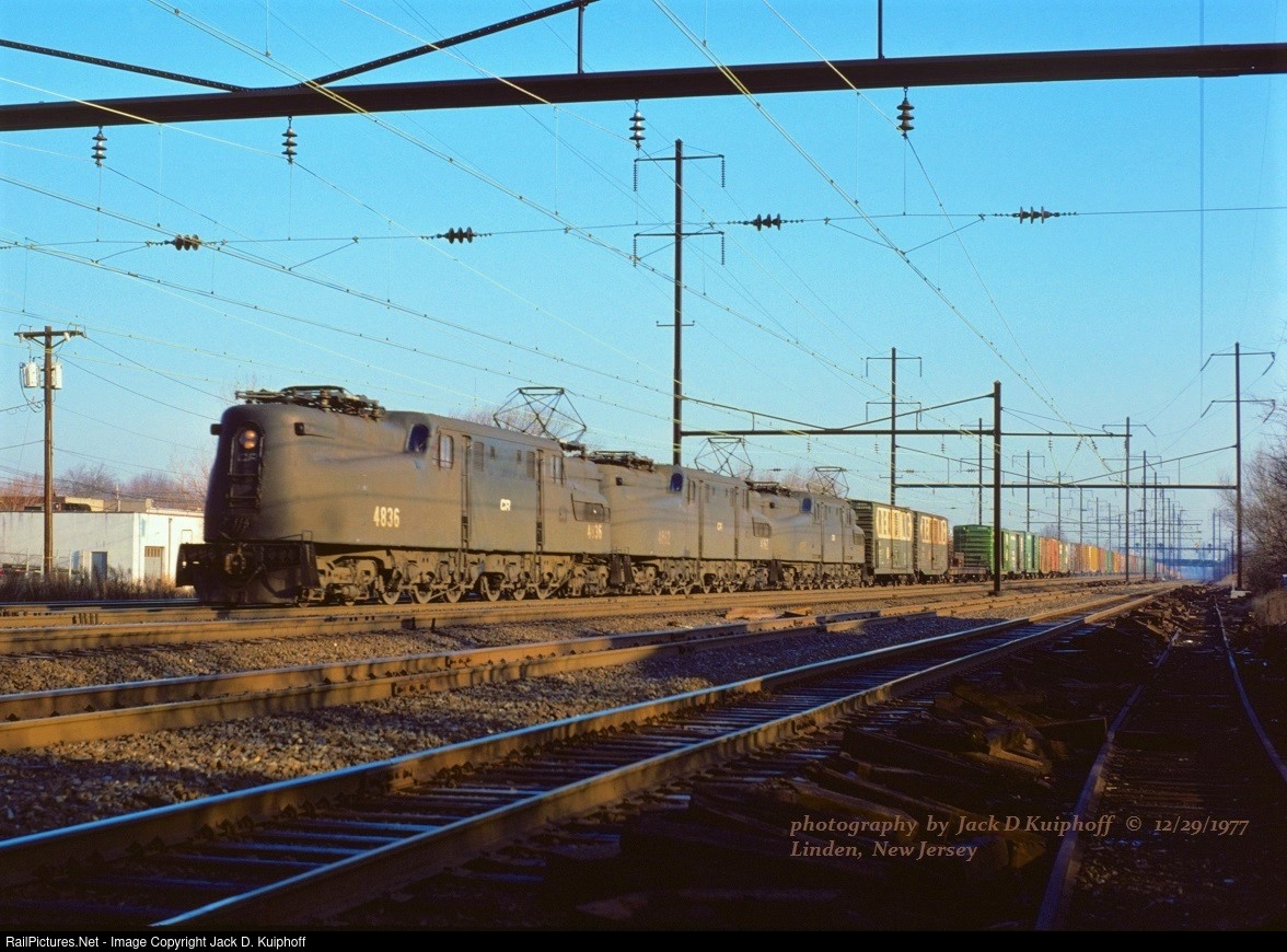| CR, Conrail GG1's 4836-4862-4818, has a long freight in tow south/west bound on the NEC, Northeast Corridor at Linden, New Jersey. December 29, 1977. Jack D Kuiphoff © photo |
