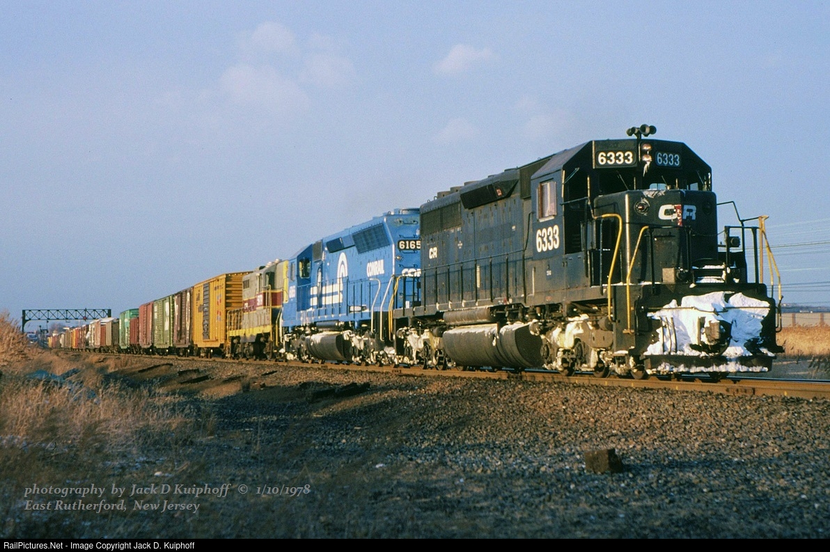| CR, Conrail 6333- 6135- 5969--, with a eastbound NY74 on the ex-Erie at East Rutherford, New Jersey. January 10, 1978. Jack D Kuiphoff © photo |