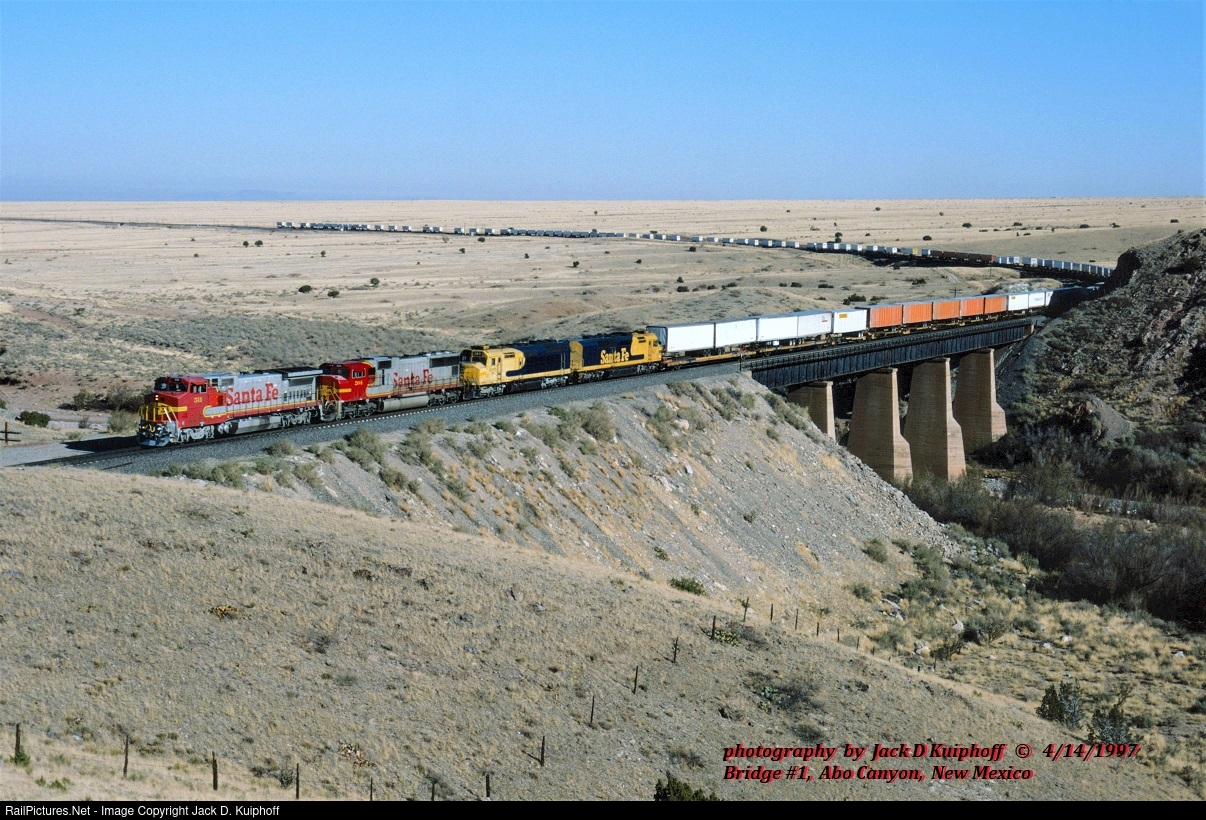 AT&SF, Santa Fe, B40-8W 511 leads-204-5971-5951 leads an eastbound across bridge 1, in Abo Canyon, New Mexico. April 14, 1997. Jack D Kuiphoff photo ©