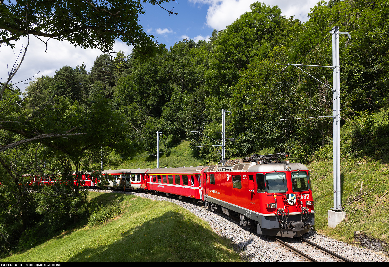 | Ge 4/4 II # 632 of the Rhaetian Railway pulls regional train 1437 of the line R16 from Chur to Arosa, on the 6 % grade between St.Peter-Molinis and Peist. Second car is standard car type I # 2319 decorated in and outside as "Bärenland" car. |