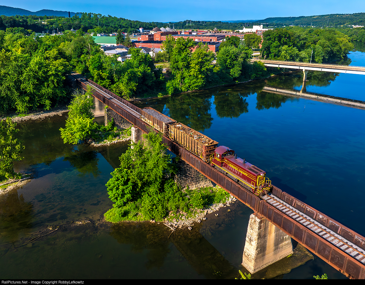 JVR 1 leads JVRR 2106 over the Juniata River Bridge in Lewistown, Pennsylvania, as the local train heads toward the Standard Steel Factory for pickups and drop offs |
